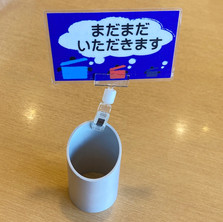 テーブルには、表が「まだまだいただきます」、裏が「ちょっと休憩」の札が用意されています。ピッツァを持ってテーブルを回っている店員さんは、この札を見てピッツァを配っていきます。