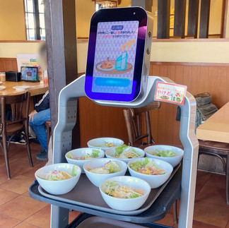 ドリンクバーから席に戻ると、配膳ロボットがサラダを運んできたところでした。この店の配膳ロボットは、前からも後ろからも、料理が取れるようになっています。