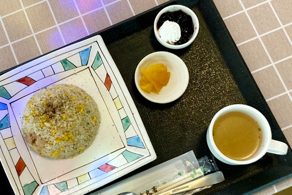 ランチの料理が運ばれてきます。注文した料理のうち、鱈と野菜の黒酢あんかけ、ハンバーグ、チャーハンの写真を撮らせてもらいました。料理には、ごはん・みそ汁(またはスープ)・サラダ・デザートが付いていました。